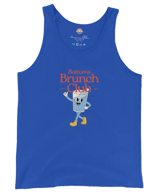 This cheeky design features a fabulously confident glass character in bold yellow boots, proudly standing beside the club’s signature text: Bottoms Brunch Club ESTD. 2021. Whether you’re flexing for thirst traps or just showing off that post-brunch glow, this tank lets you do it in style.