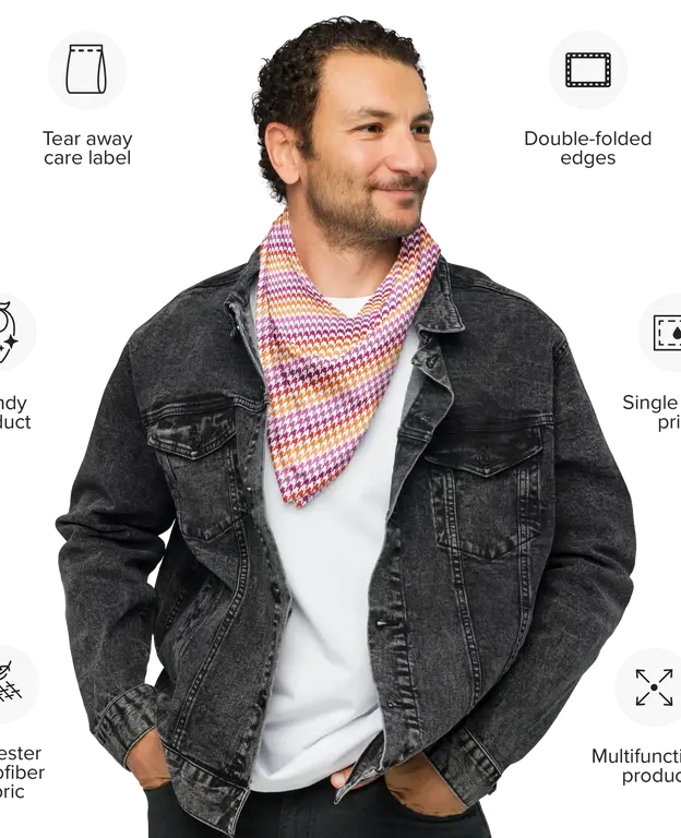 Turn up the color and the pride with our Lesbian Sunset Houndstooth Bandana. This vibrant accessory features a playful houndstooth pattern in the iconic orange, pink, and white shades of the lesbian sunset flag. Whether you wear it or share it with your pet, this bandana adds LGBTQ+ visibility and a bold pop of style to any look. Sizes range from 17.38" (Small), 21.25" (Medium) and 25.25" (Large). We recommend a small size for pets and both the medium and large for adults.