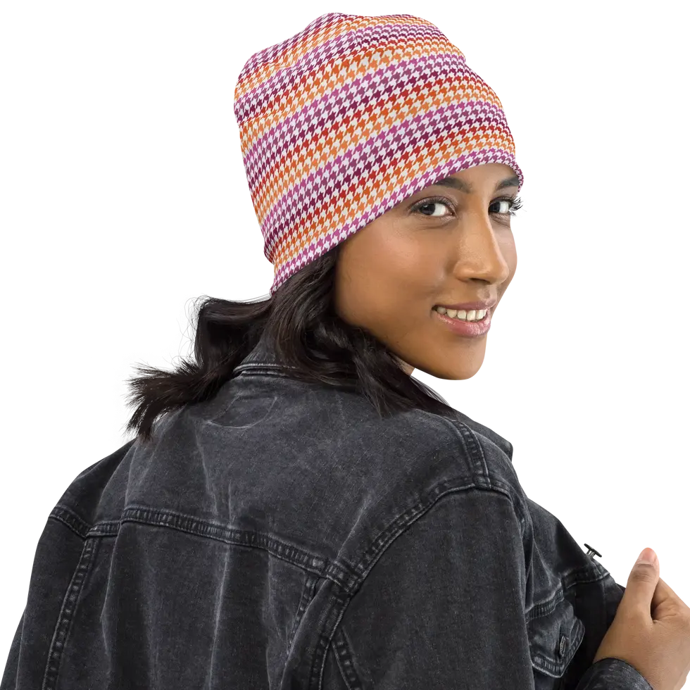 Turn up the warmth and the pride with our Lesbian Sunset Houndstooth Beanie. This eye-catching accessory features a vibrant houndstooth print in the iconic shades of the lesbian sunset flag—orange, pink, and white—making it a must-have for anyone who wants to celebrate lesbian identity and LGBTQ+ community in style.