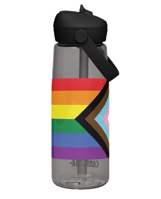 - Style: 25 oz CamelBak flip-straw water bottle with wraparound Progress Pride flag print